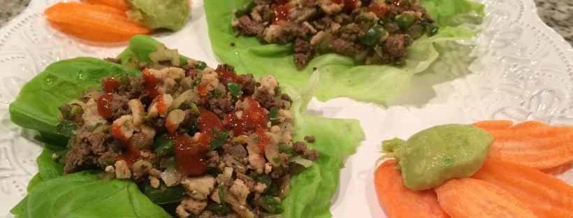 - Place two Bibb lettuce leaves on a plate and add about 2 oz portions of the ground meat mixture in each leaf